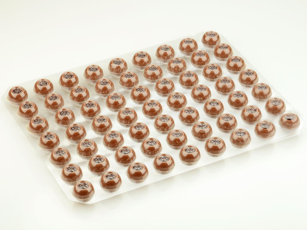 Jede Folie enthält 63 Hohlkörper, die perfekt für die Weiterverarbeitung eignet sind. Die Schokoladen-Hohlkugeln können einfach mit verschiedenen Pralinenmassen befüllt und anschließend mit temperierter Kuvertüre verschlossen werden.