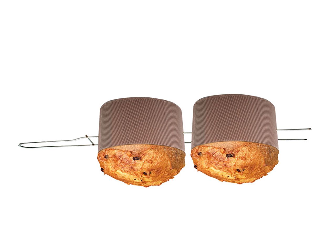 Panettone Wender für Panettone Papierbackformen. Die fertig gebackenen Panettone werden mit diesem Wender aufgespießt und kopfüber zum Auskühlen aufgehängt. Somit behalten die Panettone ihre typische, traditionelle Form. Es können bis zu 2 Panettone aufgehängt werden.
