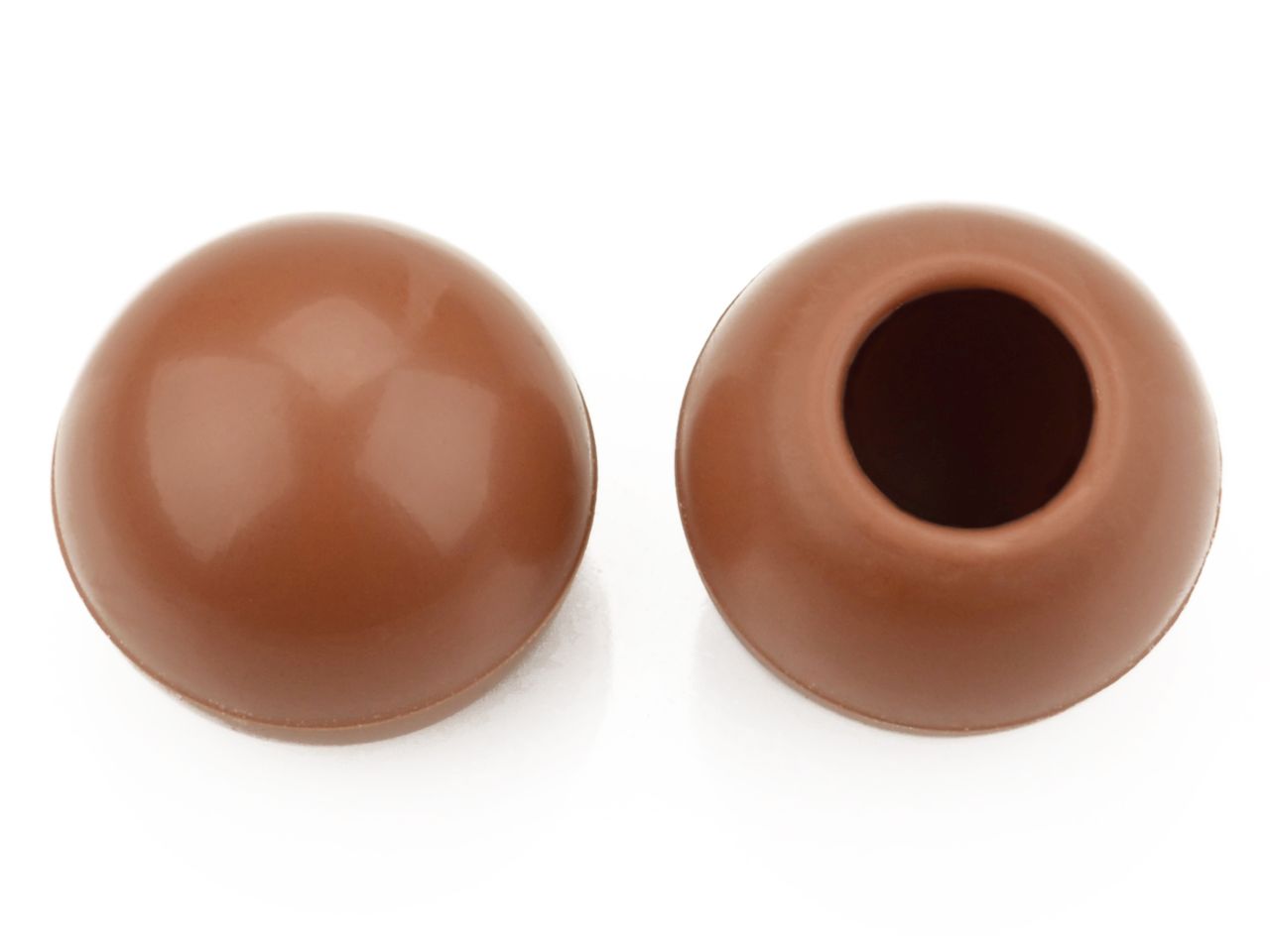 Hochwertige Pralinenhohlkörper. Jede Folie enthält 63 Schokoladen-Hohlkugeln, die sich perfekt für die schnelle Weiterverarbeitung eignen. Die Hohlkörper können einfach mit verschiedenen Pralinenmassen befüllt werden und müssen anschließend nur noch mit temperierter Kuvertüre verschlossen werden.