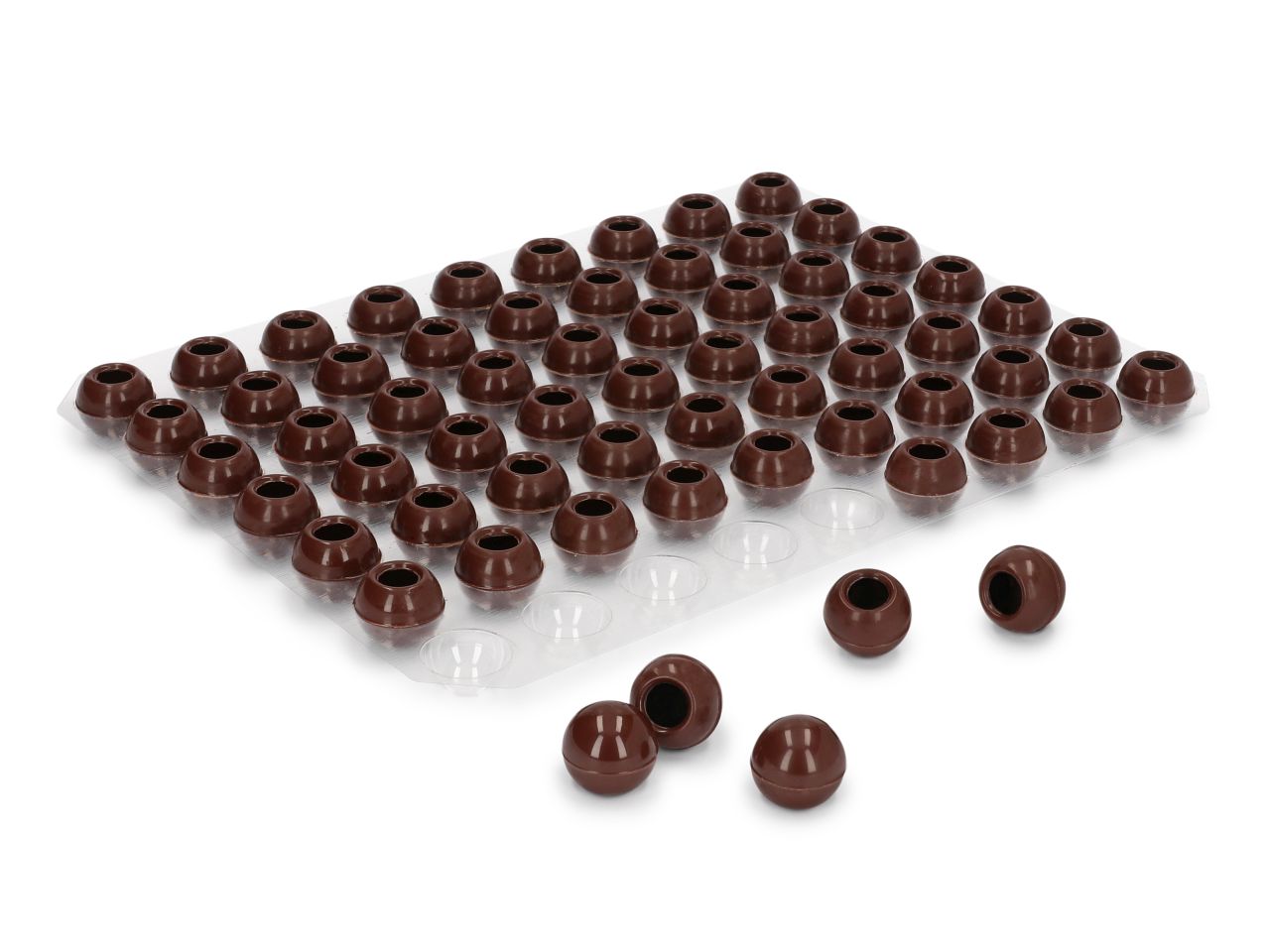 Hochwertige Pralinenhohlkörper. Jede Folie enthält 63 Schokoladen-Hohlkugeln, die sich perfekt für die schnelle Weiterverarbeitung eignen. Die Hohlkörper können einfach mit verschiedenen Pralinenmassen befüllt werden und müssen anschließend nur noch mit temperierter Kuvertüre verschlossen werden.